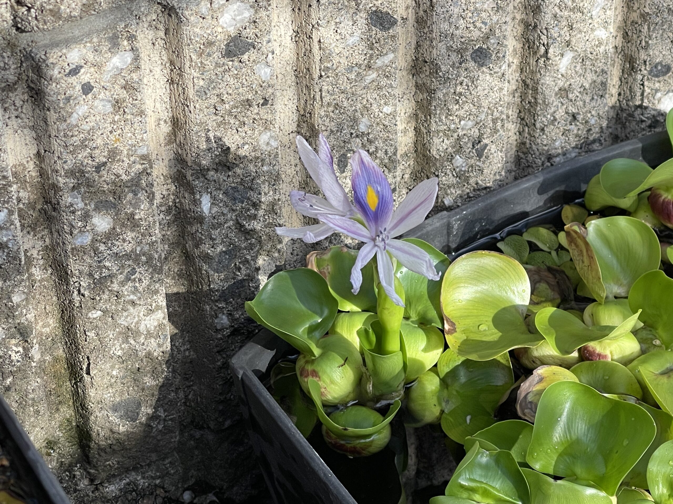 ビオトープで増えすぎたホテイアオイを別のプランターに分けて放置していたのですが、花が咲いていました。